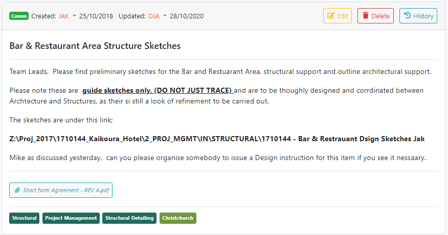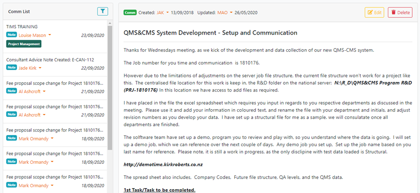 The comms system in TIMS is designed to be the main place for job related communications to be recorded in TIMS. This allows people to easily locate information related to the job, have discussions about particular items, share attachments and record notes.