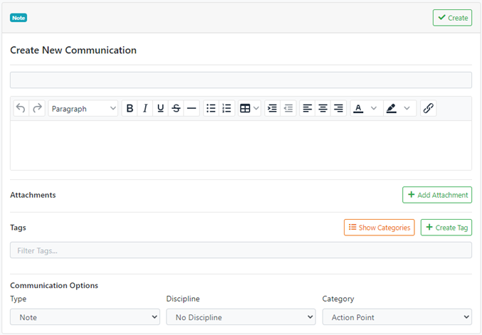 Here you can enter the title and body of the comm, as well as upload any attachments and include any tags that categorize the comm.