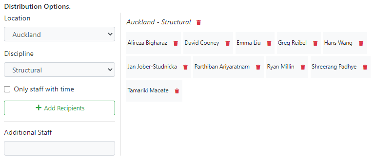 In the example above the Location "Auckland" and the discipline "Structural" were selected, then "Add Recipients" was clicked, adding all people in the Auckland Structural discipline to the distribution list.