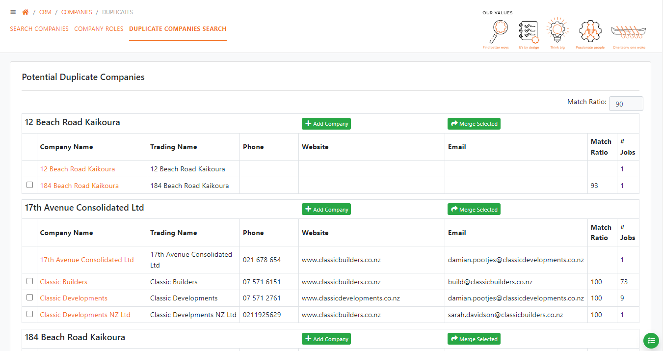 Alternatively Users with the Maintain Data permission can also merge companies from the Duplicate Companies Search page. This page can take a while to load, but once it does it lists companies where the details match or are very similar. From here scroll down the page to find the Company Heading for the company to be retained/merged into, then tick the checkbox of the company to be merged and removed, or if the company has not automatically been found click the Add Company button and search for the company to merge.Multiple companies can be selected before clicking the Merge Selected button. You will be prompted to confirm the merge is correct, if all is correct then click OK and the merge will be confirmed. If an error occurs merging any of the companies selected, the entire merge is rolled back so all data will be as it was prior to the merge.