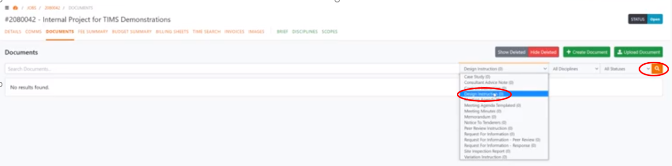 Search for Documents: To search for documents search filter options are Documents Title, All Disciplines, All Statuses. In this example we’re searching by Document Title, highlighting the document title 'Design Instruction' and selecting the search icon to bring up the document. We can also search for documents by discipline title or particular statuses.